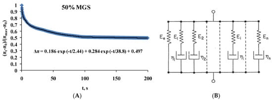 In the framework of the generalized Maxwell model (panel B of Figure 6), the equation represents a rheological system of parallel elements in which each exponential term corresponds to a Maxwell spring-and-dashpot element and ΔπEQ to a spring element denoting equilibrium elasticity [,]. The relaxation time of each Maxwell element is defined as the ratio between its viscosity and elastic modulus (τi = ηi/Ei).