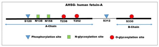 Amino acid sequence of human fetuin-A. The mature form of AHSG consists of A-chain (residues 1–282); connecting peptide (grey line) residues 283–321; B-chain residues 323–349. There are two phosphorylation sites (residues S120 and S312); two N-glycosylation sites (N138, N158) and two O-glycosylation (T238, T252) sites in the A-chain. There is one O-glycosylation site in the B-chain (S330).