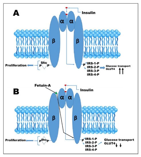 Insulin signaling. (A), activation of the insulin receptor by binding of insulin to the α-subunits of its receptor, initiates autophosphorylation of the intracellular portion of the β-subunits, resulting in the recruitment and phosphorylation or receptor substrates such as IRS-1, IRS-2, IRS-3, and IRS-4 Shc proteins. Shc activates Ras-MAP pathway, culminating in proliferation. IRS proteins activate the PI3K-AKT pathway, the signal of which is transmitted to promote translocation of GLUT4 and glucose transport into the cell. (B), the binding of fetuin-A to the extracellular portion of beta subunit attenuates tyrosine kinase signaling, resulting in reduced glucose transport and hence a possible source for insulin resistance.