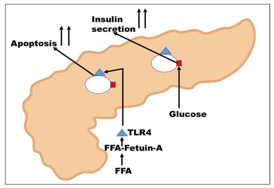 A rise in the blood glucose level is initially sensed by the β-islets cells where glucose is internalized via the cell surface GLUT2 transporters (red square in Figure 4), eventually leading to increases in insulin secretion []. Recent studies have indicated a robust cross-talk between fatty pancreas and fatty liver affecting the local inflammation and insulin secretion by the islets cells. In these studies, differentiated adipocytes were detected in the vicinity of pancreatic islet cells [,]. Expression levels of cytokines such as IL6 and CXCL8 were elevated by fetuin-A and free fatty acids such as palmitate in a TLR4-dependent manner [,,]. Interestingly, it has been demonstrated that free fatty acids such as palmitate do not bind directly to TLR4 but rather via fetuin-A []. In other words, palmitate interacts with fetuin-A, which then links the FFA to TLR4, to induce pro-apoptotic signals in islet cells, as shown in Figure 4. Fetuin-A also impaired glucose-induced insulin secretion in a c-Jun N-terminal kinase (JNK)- and Ca2+-dependent manner [,]. Interestingly, JNK and other pro-inflammatory cytokines such as TNFα can mediate serine phosphorylation of the IRS proteins associated with the insulin receptor, resulting in its inhibition []. Thus, increased secretion of fetuin-A in adipose tissue engages toll-like receptors (TLRs), contributing to pro-inflammatory state leading to insulin resistance and metabolic syndrome [,,]. This is another mechanism by which fetuin-A mediates insulin resistance in T2DM.