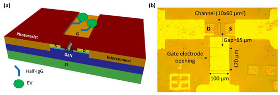 The structural information of the biosensor is depicted in Figure 1. The sensing region comprises of the openings on the gate electrode and the transistor channel, separated by a very short gap of 65 µm. The separated gate electrode is in fact the reference electrode used in conventional FET biosensors, but re-purposed to provide high field modulation to FET sensing. The schematic illustration of GaN HEMT biosensor is depicted in Figure 1a, which shows the gate electrode functionalized with the receptor, in this case, antibody, which targets the exosomes from the test solution. The real top view image of the GaN HEMT biosensor device is shown in Figure 1b. The opening on the channel region is 10 × 60 µm2 in an area separated by 65 µm from the gate electrode opening, which is 100 × 120 µm2 in area. The test solution containing the target exosomes is dropped on the sensor surface such that it forms the dielectric between the gate electrode and channel openings. Assuming the HEMT channel has negligible resistance, the sensing structure can be regarded as two metal electrodes of asymmetric sizes connected by an electrolyte which is the test solution.