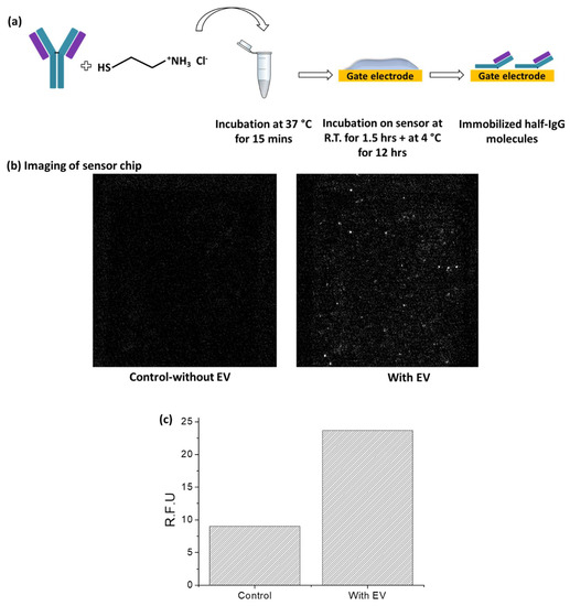 (a) Schematic illustration of surface functionalization process. (b) Imaging functionalized sensor chip with and without EVs. Left hand side image of the gate electrode represents control i.e., functionalized sensor without EVs. Right hand side image of the gate electrode shows the functionalized sensor with captured EVs. (c) Relative fluorescence intensity of functionalized sensor chip with and without EVs.