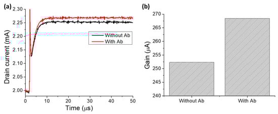 The surface functionalization can also be monitored electrically. The interface of the solution and gate electrode changes as IgG molecules are bound to the electrode surface. This follows that when the electric field is applied across the test solution, EDL on the gate electrode interface is modified, which leads to a corresponding charge re-distribution in the EDL on the solution-transistor dielectric region. This leads to a change in solution capacitance and hence the drain current response of the HEMT sensor. Therefore, by monitoring the drain current before and after surface functionalization, as shown in Figure 3a, we can indeed characterize the antibody immobilization procedure. Figure 3b shows the change in current gain of HEMT biosensor upon surface functionalization, which is the differential drain current signal that is used as the sensor index of measurement throughout this study.