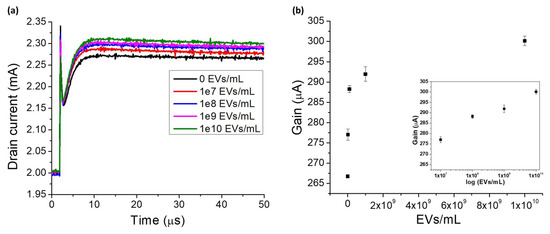 The sensing characteristics of GaN HEMT biosensor are demonstrated by the quantitative measurement of different concentrations of EVs on the sensor surface. The sensor response measured after surface functionalization with anti-CD63 is used as the baseline for further measurements with EVs. EV concentrations in the range of 107–1010 EVs/mL are used in this study. Figure 4a shows the drain current signal of the HEMT sensor for different EV concentrations. The drain current increases as the number of EVs increases. This is because when the anti-CD63 binds with the CD63 expressed on the exosomal membrane and when gate pulse voltage is applied, the EDLs at the gate electrode and transistor dielectric interfaces undergo charge re-distribution, which changes the solution capacitance. As seen from Equation (4), at fixed gate voltage when solution capacitance is varied, the potential drop across the transistor dielectric is varied and as a result the drain current of HEMT changes. The channel of HEMT is composed of 2-dimensional electron gas (2DEG) which is highly sensitive to changes in the gate potential. As the number of captured EVs on the gate electrode increases, the potential drop across the solution decreases, causing more potential to drop across the transistor dielectric. This leads to larger changes in the drain current of HEMT. The change in drain current is thus proportional to the number of EVs captured at the sensing region. We use current gain as the sensor measurement index to avoid the inconsistencies in absolute drain current. Figure 4b shows the calibration curve of the HEMT biosensor, with current gain versus the number of EVs captured on the sensor. The inset demonstrates the sensor response curve in logarithmic scale, to better represent the linearity of sensor response over the wide dynamic range of detection of EVs. The results in Figure 4 demonstrate that our GaN HEMT biosensor can be used to enumerate EVs in the range of 107–1010 EVs/mL, which includes two orders lower and one order higher than the normal EV concentration in humans which is 109 EV/mL [21,22]. Thus, our electronic microsensor can detect and enumerate EVs with very high sensitivity in physiological salt environment, without requiring additional sample pre-processing or extra reagents/labels. The dynamic range of detection exhibited by our GaN HEMT sensor is comparable to the gold standard EV detection methodology of nanoparticle tracking analysis (107–1010 EVs/mL). Enumeration of EVs has the potential for risk assessment of cardiovascular diseases like coronary artery disease and early diagnosis of several types of cancers such as ovarian, lung and gastric cancer [23,24,25,26,27]. Therefore, our electronic microsensor has the potential to improve point of care diagnostics for diseases that cause the largest mortality worldwide.