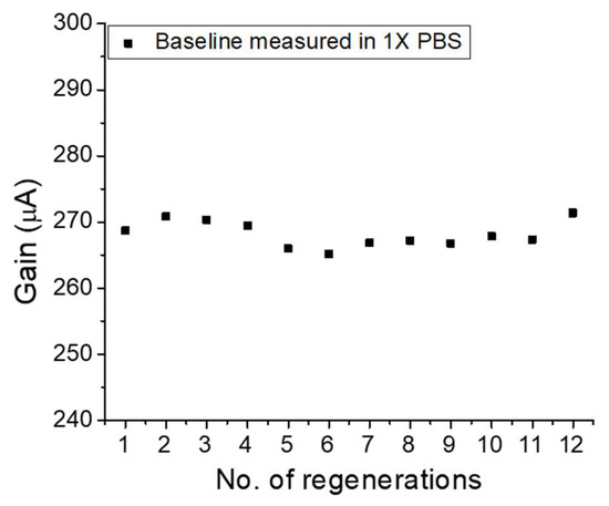 After each sample of EV is measured, the sensor is thoroughly washed in protein elution buffer and 1× PBS to remove captured EVs and non-specific binding, if any. The washing procedure is detailed in Methods Section 2.4. We use a gentle elution buffer with near neutral pH, containing very high salt concentration. The high salt in the buffer is intended to break the electrostatic interactions between the receptor and ligand, thereby eluting them. 1× PBS is used to further wash away the elution buffer and serves as the test environment for further measurements. The electrical baseline of the sensor is measured to confirm whether it has returned to the original reference value, which corresponds to that of the anti-CD63 level. The electrical baseline values between each sample measurement is shown in Figure 5 in terms of gain responses of the HEMT biosensor. The current gain returns to the initial reference value, with each elution procedure, thereby ensuring that the change in gain observed in the sensor calibration curve is indeed resulting from the capture of EVs and not due to non-specific binding. In this study where the four different target EV concentrations have been tested for three different times, the sensor has been regenerated at least 12 times. The results in Figure 5 demonstrate the sensor regeneration capabilities which allow our sensor to be re-used for multiple EV detection and enumeration cycles.