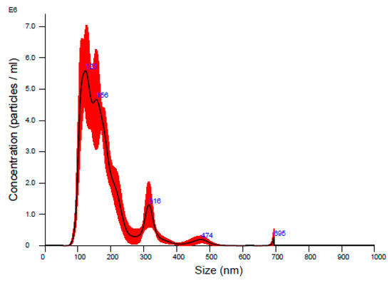 Concentrated EV samples were diluted 80-fold with 0.22 μm-membrane-filtered PBS and subjected to an NS300 nanoparticle analyzer (NanoSight, Salisbury, UK) to determine the concentration and size distribution using NTA software version 3.2. Stock EV concentration is 4.8 × 1010 EVs/mL as assessed by using NTA as shown in Figure 6.