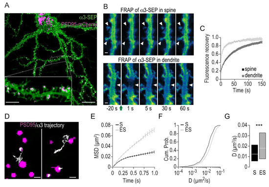 The Na,K-ATPase catalytic subunit α3 is highly mobile in hippocampal neurons. (A) Representative confocal picture of a hippocampal neuron (DIV24) transfected with α3 tagged with superecliptic pHluorin (SEP, green) and PSD95-mCherry (magenta). α3-SEP is expressed in dendritic segments and dendritic spines. Scale bars, 20 μm and 5 μm in the inset. (B,C) Fluorescence recovery after photobleaching (FRAP) analysis of α3-SEP dynamics in dendritic segments and dendritic spines. (B) Time lapse images following photobleaching of α3-SEP in dendrites and spines. Images were pseudo-color-coded for SEP intensity. The green arrow indicates photobleaching, and white arrowheads indicate the regions that have undergone photobleaching. Scale bars represent 1 μm. (C) Mean ± standard error of the mean (SEM) of the normalized fluorescence intensity after photobleaching over time in dendritic segments (grey) and dendritic spines (black). (D–G) Lateral diffusion of α3 studied with SPT-QD. (D) Representative trajectories (white) of QD-bound α3-SEP in the membrane of hippocampal neurons and over PSD95-mCherry domains (magenta). Left, trajectories exchanging between synaptic and extrasynaptic regions; right, trajectories restricted to either extrasynaptic or synaptic regions. Scale bars represent 1 μm. (E) Mean ± SEM mean square displacement (MSD) plots for QD-bound α3-SEP in the extrasynaptic (ES, grey) and synaptic (S, black) regions. Cumulative probabilities (F) and median ±25–75% IQR (G) of the QD-bound α3 diffusion coefficient D in the extrasynaptic (ES, grey, n = 3678 trajectories) and synaptic (S, black, n = 610 trajectories) regions. *** p < 0.001 with the Mann–Whitney U test.