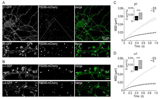 Comparison of α3, α1 and β1 expression and diffusion characteristics. (A) Maximum intensity projection of a structured illumination microscopy Z-stack through a DIV24 hippocampal neuron co-expressing β1-GFP (green) and PSD95-mCherry (magenta). Scale bar represents 10 μm. Insets, structured illumination microscopy images of the region in the white rectangle showing dendritic segments and dendritic spines co-expressing β1-GFP together with PSD95-mCherry. Scale bars represent 1 μm. (B) Structured Illumination Microscopy images of dendritic segments and dendritic spines co-expressing α1-SEP (top panels, green) or α3-SEP (lower panels, green) together with PSD95-mCherry (magenta). Scale bars represent 1 μm. (C,D) Mean ± SEM MSD plots for QD-bound β1-GFP (C) and α1-SEP (D) in the synaptic (S, black lines) and extrasynaptic (ES, grey lines) regions. Insets, median ±25–75% IQR of the QD-bound diffusion coefficients D in the synaptic (black boxes, n = 82 trajectories for α1, n = 264 for β1) and extrasynaptic (grey boxes, n = 360 trajectories for α1, n = 871 for β1) regions in cells expressing β1-GFP (C) or α1-SEP (D). *** p < 0.001 with the Mann–Whitney U test.