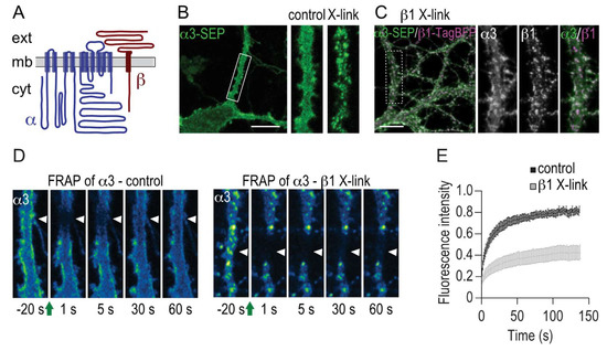 Cross-linking of β1 clusters α3 at the membrane and reduces its membrane dynamics. (A) Membrane topology model of the α and β subunit comparing extracellular (ext) and cytoplasmic (cyt) domains. (B) Extracellular cross-linking of α3-SEP using goat polyclonal anti-GFP (5 μg/mL, 10 min) and polyclonal donkey anti-goat IgG (10 μg/mL, 10 min) leads to reorganization and clustering of α3 in the membrane. Representative image of a hippocampal neuron at DIV24 expressing α3-SEP. The region in the white rectangle is shown in higher magnification as inset before (control) and after (X-link) cross-linking. Scale bar represents 10 μm. (C) Cross linking of β1 clusters α3. Representative image of a hippocampal neuron at DIV24 expressing α3-SEP and β1-TagBFP and subjected to antibody cross-linking against β1-TagBFP with rabbit polyclonal anti-TagRFP (5 μg/mL, 10 min) and polyclonal goat anti-rabbit IgG (10 μg/mL, 10 min). Scale bars represent 5 μm. Single fluorescence channels from the region in the white rectangle are shown in higher magnification as insets. (D,E) Fluorescence recovery after photobleaching (FRAP) analysis of α3 dynamics in dendritic segments in control conditions (D, left) or in dendritic segments subjected to antibody cross linking of β1 (D, right). Time lapse images following photobleaching of α3-SEP were pseudo-color-coded for SEP intensity. The green arrows indicate photobleaching, and white arrowheads indicate the regions that have undergone photobleaching. (E) Mean ± SEM of the normalized fluorescence intensity over time in dendritic segments in control conditions (black, n = 10 cells, 3 cultures) and when β1 is cross-linked (grey line, n = 11 cells, 3 cultures).