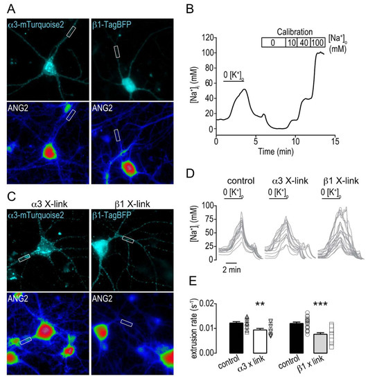 We then investigated whether such β1-mediated restriction of α3 mobility would impact the Na,K-ATPase-mediated Na+ extrusion efficiency. Here, we used hippocampal neurons expressing β1-TagBFP or α3-mTurquoise2 (constructed similar to α3-SEP) to avoid fluorescence overlap with the Na+-sensitive dye Asante Natrium Green-2 (ANG2). Cells were loaded with ANG2 and intracellular Na+ was recorded in primary or secondary dendritic segments (Figure 4A). A transient increase of intracellular Na+ was induced by perfusing cells with a K+-free buffer that inhibits Na,K-ATPase mediated Na+ extrusion. Upon subsequent perfusion with normal K+-containing buffer, Na,K-ATPase activity resumed. The rate of Na+ extrusion was then determined from the calibrated ANG2 signal (Figure 4B and see methods section). Expressed α3-mTurquoise2 or β1-TagBFP was selectively cross-linked to immobilize Na,K-ATPase and the formation of clusters at the membrane was verified (Figure 4C). The Na+ extrusion rates were then measured and found to be reduced by 23 ± 9% when α3-mTurquoise2 was cross-linked and by 36 ± 8% when β1-TagBFP was cross-linked (Figure 4D,E).