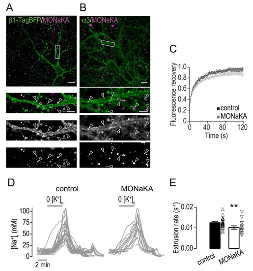 We then performed FRAP experiments on primary hippocampal neurons expressing α3-SEP to test if MONaKA-induced clustering of α3 also affects the mobility. In neurons treated for 24 h with MONaKA, the mobile fraction of α3 was reduced from 89.8 ± 2.5% to 75.8 ± 2.5% (Figure 5C). To test if this reduction in mobility and clustering by MONaKA influence the Na+ transport efficiency, as shown in the cross-linking experiments, we determined the Na+ extrusion rate in non-transfected hippocampal neurons and found it to be reduced by 18 ± 10% after 24 h of MONaKA treatment (Figure 5D,E).