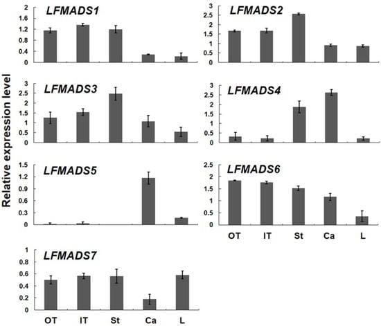 2.4. Expression Patterns of Seven MADS-Box Genes of L. formosanum