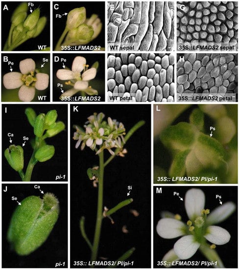 - Tzeng, T.Y.; Yang, C.H. A MADS box gene from lily (Lilium Longiflorum) is sufficient to generate dominant negative mutation by interacting with PISTILLATA (PI) in Arabidopsis thaliana. Plant Cell Physiol. 2001, 42, 1156–1168. [Google Scholar] [CrossRef] [PubMed]