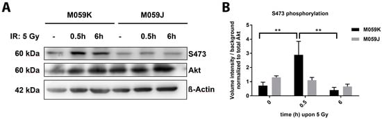 Our earlier work revealed that DNA-PKcs phosphorylates Akt1 at S473 but not vice-versa in the presence of damaged DNA, at least in a protein-based in vitro assay []. To explore if DNA-PKcs might also execute radiation-induced Akt-S473 phosphorylation in intact cancer cells, we analyzed the time-dependent phosphorylation of Akt-S473 in irradiated DNA-PKcs-deficient (M059J) and DNA-PKcs-proficient (M059K) human glioblastoma cell lines (Figure 1; Figure S1A). Indeed, we observed a transient but significant increase in phosphorylation of Akt-S473 in the DNA-PKcs-proficient cell line M059K upon IR with 5 Gray (Gy) that was not detected in the DNA-PKcs-deficient cell line M059J (Figure 1A,B). Here, the level of Akt-S473 phosphorylation remained constant during the observation period. Similar observations were made when Akt-S473 phosphorylation was analyzed upon irradiation with 3 Gy (Figure S1A,B). Furthermore, we compared the kinetics in the repair of radiation-induced DSB in both cell lines upon exposure to a single dose of 3 Gy and were able to corroborate the dysfunction of DSB repair in DNA-PKcs-deficient M059J cells [] (Figure S1C).
