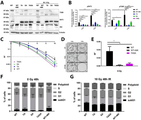 Our previous data also indicated that the activation-associated mutations of Akt accelerate DSB repair and improve the survival of irradiated cancer cells, suggesting that Akt-activation might be crucial for its repair-promoting effects []. To gain more insight into the importance of Akt-phosphorylation at S473 and T308 for its role in the cellular radiation response, we generated TrC1 stably expressing phosphorylation-deficient eGFP-fused Akt1 mutants Akt1-TA, Akt1-SA, and Akt1-TASA by using retroviral gene transfer (Figure 2A,B). For a better comparability of data obtained in the generated cell lines, we adjusted the expression level of Akt1-eGFP fusion proteins in all generated cell lines by cell sorting based on the eGFP-intensity ensuring that the GFP-fused Akt-variants were expressed at largely increased levels compared to the endogenous protein (Figure 2A). We also confirmed the lack of phosphorylation of the overexpressed double phosphorylation-deficient Akt1-TASA-eGFP fusion protein (87 kDa) whereas the 60 kDa endogenous Akt protein was still phosphorylated at S473 and T308 (Figure 2A,B).