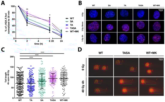 Thus far, our data indicated that the overexpression of the phosphorylation-deficient Akt1 mutants Akt1-SA or Akt1-TASA increased the radiosensitivity of TrC1 when compared to Akt1-WT overexpressing TrC1 (Figure 2C–E). Since our earlier work revealed an association of increased radioresistance of TrC1 overexpressing activation-associated Akt1-mutants with alterations in the kinetics of radiation-induced DSB repair, we hypothesized that the overexpression of the phosphorylation-deficient Akt1 mutants might affect DSB repair. We, therefore, compared the effects of the genetic or pharmacologic inhibition of Akt1-phosphorylation at T308 and S473 on the kinetics of radiation-induced DSB repair in TrC1. The overexpression of the Akt1-TASA mutant with impaired phosphorylation at T308 and S473, as well as the treatment of TrC1 overexpressing Akt1-WT with the Akt-inhibitor MK-2206 led to a significant deceleration of DSB repair upon irradiation as determined by the γH2A.X assay (Figure 4A,B). Instead, the resolution of γH2A.X was only slightly slower in Akt1-SA overexpressing cells without reaching significant levels.