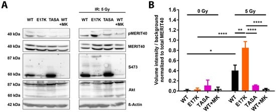 To further explore the suggested link between the Akt activation state and the phosphorylation of MERIT40, we additionally investigated the impact of the overexpression of the activation-associated and clinically relevant Akt1-E17K mutant described in our recent publication []. Of note, here we observed a strong increase in radiation-induced phosphorylation of MERIT40 in Akt1-E17K overexpressing TrC1 (Figure 5A,B).