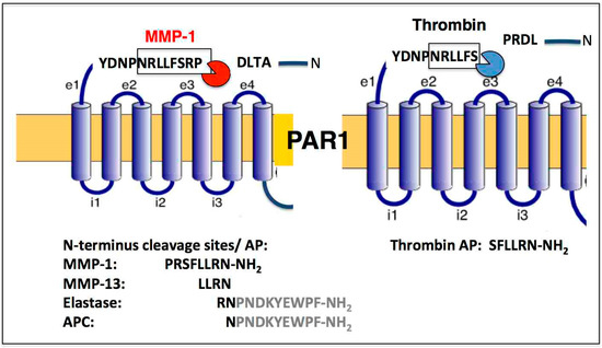 PAR1 is a family member of the four PARs that also include PAR2–4, which act as exquisite sensors to a select group of proteases [14]. PAR1 is classically activated through thrombin [15] by cleaving its exodomain at the R41–S42 peptide bond (Figure 1) [15,16,17]. Matrix metalloproteases (MMPs) are well known as important mediators of both atherothrombotic disease [18,19] and cancer [2,20,21,22,23]. This is especially relevant for the metastatic processes since physiologic levels of MMPs are low, but expression is elevated in most invasive cancers [2,18,24].