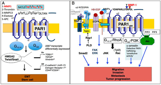 (A). Schematic diagram of PAR1 and HMGA2, Twist/Snail mediated transcriptional regulation of mesenchymal markers, and down-regulation of epithelial markers. Both HMGA2 and Twist further regulate expression of PAR1. TGF-β has a prominent role in the regulation of these processes and stem cell markers. PAR1-biased signaling is orchestrated by a diverse set of unique proteases canonical (thrombin) and noncanonical (MMP-1, MMP-13, elastase, APC) that cleave the PAR1 extracellular loop 1 (e1) at indicated amino acid residues. (B) Multiple signaling pathways control PAR1-mediated tumor progression (migration, invasion, and metastasis) that are mediated through PAR1 coupled G-proteins including G12,13 and Gi,q. PAR1 is constitutively turned on as a result of defective PAR1 trafficking. Parallel PAR1 signaling pathways through G12,13-RhoA link outside extracellular matrix signals with β1 integrin, TGF-β, and EGFR transactivation that regulate proliferative and migratory responses (ERK1/2, FAK, Smad2) while Gi,q-PI3K harness Akt-survival pathways and Rac result in the invasion and, ultimately, in metastasis.