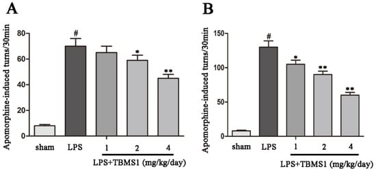 2.1. TBMS1 Treatment Improves the Behavioral Dysfunction of LPS-Injected PD Rat Model
