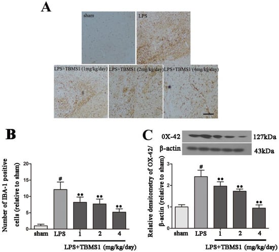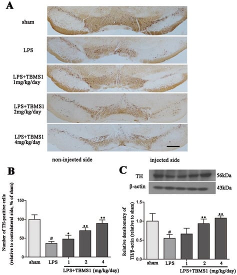 2.3. TBMS1 Inhibits LPS-Induced Over-Activation of Microglia in the SN