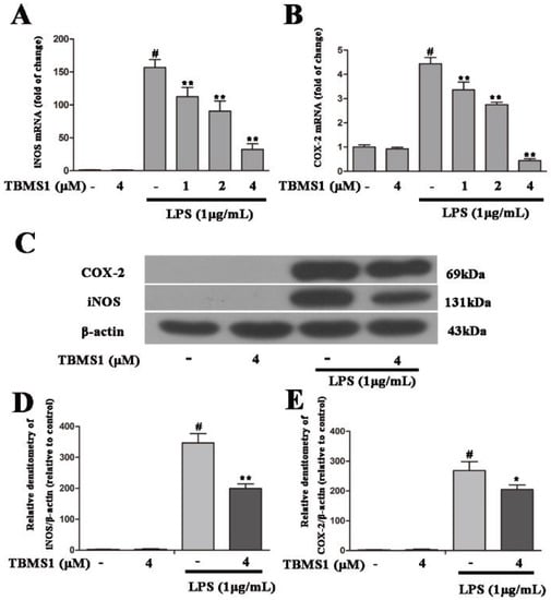 2.6. TBMS1 Inhibits the Production of Pro-Inflammatory Enzymes in LPS-Exposed BV-2 Cells