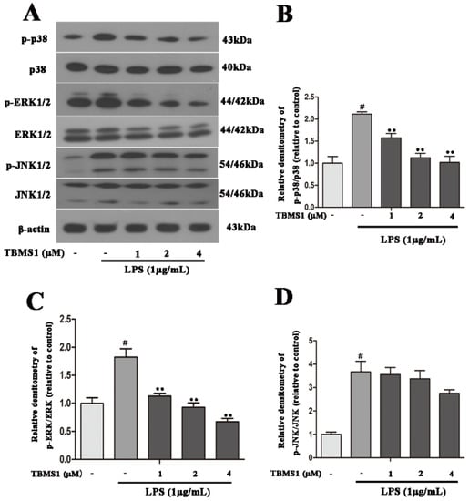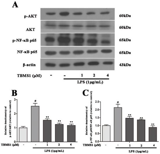 2.7. TBMS1 Inhibits the Phosphorylation of AKT, NF-κB p65, ERK1/2 and p38 in LPS-Exposed BV-2 Cells