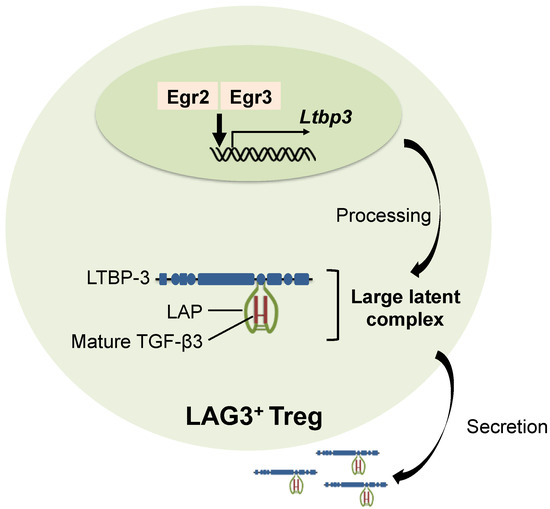 LTBPs are multi-domain glycoproteins that interact with fibrillin microfibrils [67]. Of the four isoforms of LTBP, LTBP-1 and LTBP-3 bind to all three TGF-β isoforms, whereas LTBP-2 does not bind the LAP of any TGF-β isoform, and LTBP-4 is supposed to interact only with the TGF-β1 LAP [68]. The disulfide bond between LAP and LTBP is an bridge between cysteine residues in the LAP and LTBP [69]. Genetically mutated mice with the cysteine residue in the LAP changed to serine exhibit systemic inflammation, although not as strong as Tgfb1 knockout mice, and reduced serum TGF-β1 levels; thus, the association of latent TGF-β1 with LTBP is important for extracellular TGF-β1 activity [70]. However, the specific binding of LTBP-1 or LTBP-3 to each TGF-β isoform has not been clearly demonstrated [71]. Recently, we reported that secretion of TGF-β3 by LAG3+ Tregs is regulated by LTBP-3 in T cells (Figure 1) in a murine model of lupus [60]. Additionally, deletion of Egr2 and/or Egr3 decreases Ltbp3 expression [60]; thus Egr2/Egr3 could be critical for TGF-β3 synthesis. Further investigation of the role of LTBPs in the secretory mechanics of TGF-β would lead to insightful findings in immune responses.