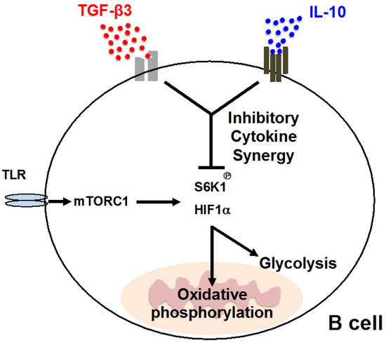 In contrast, both TGF-β1 and TGF-β3 enhance antibody production by LPS-stimulated B cells. We recently reported that TGF-βs exhibit inhibitory effects against LPS-stimulated B cells in the presence of IL-10 [96], which is a comprehensive inhibitory cytokines [107]. Cytokine synergy is a phenomenon of greater effects than the sum of its parts [108], and our report is the first to propose inhibitory cytokine synergy (ICS) [96], which is defined as a coordinated inhibitory ability of two or more cytokines, but not either cytokine alone. The ICS effects of TGF-β3 and IL-10 regulate TLR-mediated humoral immune responses both in vitro and in vivo by suppressing mammalian target of rapamycin (mTOR) signaling. The inhibition of mTOR signaling in B cells by ICS effects further suppresses cellular metabolism, including glycolysis and mitochondrial oxidative phosphorylation (Figure 2). TGF-β3 ameliorates IL-10-sufficient lupus-prone MRL/Faslpr/lpr (MRL/lpr) mice [59], but the requirement of both TGF-β3 and IL-10 in the regulation of other lupus models induced with a TLR7 agonist [109] implies the importance of considering ICS when designing future therapeutic strategies. Irrespective of the presence of IL-10, high concentrations of TGF-β3, like TGF-β1, inhibit proliferation, antibody production, and the differentiation of human B cells activated with various stimuli [87]. However, a physiological concentration of TGF-β3 enhances activated human B cells, which notably requires the presence of IL-10 [96]. Collectively, TGF-β3 has the potential to regulate systemic autoimmune diseases by inhibiting B cells. Context-dependent functionality of TGF-β3, like TGF-β1, could be an obstacle for clinical application and adequate inhibitory conditions in immune responses should be further investigated.
