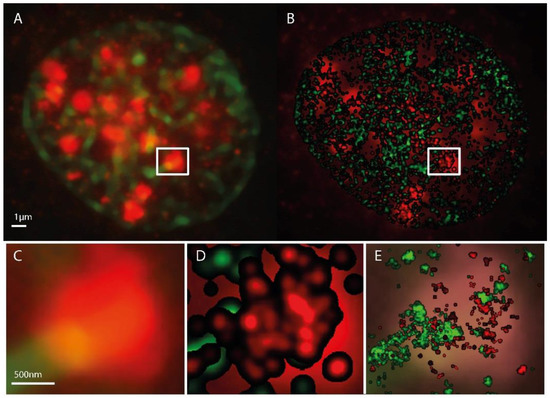 Microscopy images of H3K9me3 (green) and γH2AX (red) immunostaining in a SkBr3 cell nucleus 30 min after irradiation with 1 Gy, 6 MeV photons. (A) conventional widefield microscopy image. (B) SMLM image represented as a density image where the brightness of a point refers to the number of next neighbor points. In the background the conventional widefield microscopy image of γH2AX fluorescence is shown. The SMLM image is created from the coordinate matrix where the pixel geometry and intensity is stored in pixel values. After determination of the pixel size in nm, the coordinates and distances can be evaluated. In a fixed radius R around each coordinate, it is determined how many further coordinates are within this radius. This value is coded in the intensity of the coordinate point. In order to emphasize contiguous structures, each coordinate with an assigned value greater than zero is the starting point of a Gaussian distribution with a given sigma. The sum of all Gaussian distributions then represents the intensity distribution of the Gaussian-filtered density image (example: pixel size = 10 nm/pixel, Radius R = 1000 nm, Gaussian filter σ = 50 nm). (C) magnified insert from (A). (D) magnified insert of (B). (C,E) superposed by the standard localization image. This supposing image is directly created from the localization data. In-homogeneities and sub-structures within the γH2AX cluster are visible. Again a pixel size has to be determined. Here, every coordinate is starting point of a Gaussian distribution with the localization precision as sigma (pixel size = 10 nm/pixel).