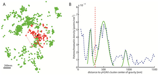 Density distribution around γH2AX cluster. (A) Schematic representation of a γH2AX cluster (red) recognized by Density-Based Spatial Clustering of Applications with Noise (DBSCAN), the center of gravity (black) and the heterochromatin (green) around it. (B) Density distribution of heterochromatin around the γH2AX cluster center of gravity (blue). This density distribution is used to classify whether a cluster is heterochromatin-associated. For this purpose, the local maxima are approximated by Gaussian functions (green). The amplitude of these maxima is then compared with the predetermined threshold value. The red line represents half the mean square distance of the convex hull of the cluster (i.e., a kind of “radius” of the cluster).