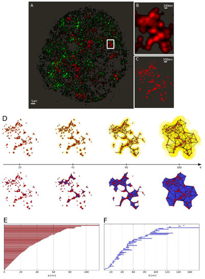 Approaches for a quantitative point density, distance, or cluster analysis exist for SMLM [23,28,29,33,34]. The analysis is restricted in scale to a certain order of magnitude and does not consider shape deformation. Quantifications on several orders of magnitude (for example in the range of a few nanometers up to several hundred nanometers) are hardly possible and cannot be easily compared according to typical characteristics. In order to overcome these restrictions, a novel mathematical approach is presented here, which analyzes SMLM data with methods of persistent homology [44]. This has the advantage that both the geometric and the topological properties of given point distributions are considered [45] and a parameter-free quantification of the structural arrangement of a point distribution over several orders of magnitude is possible. Thus, the accuracy achieved by state-of-the-art SMLM can be used, not only for a point pattern analysis, but also for a structural analysis of molecular arrangements. The point distributions and thus the underlying structures (e.g., heterochromatin distributions or γH2AX foci/clusters) can now be directly compared independently of a cell nucleus whereby both nano-scale and micro-scale level differences are considered. Mors theory and set theory allow for a quantitative comparison of two point distributions and a categorization according to a similarity measure. This higher degree of abstraction compared to image visualization achieves a higher degree of information and functionally relevant insights.