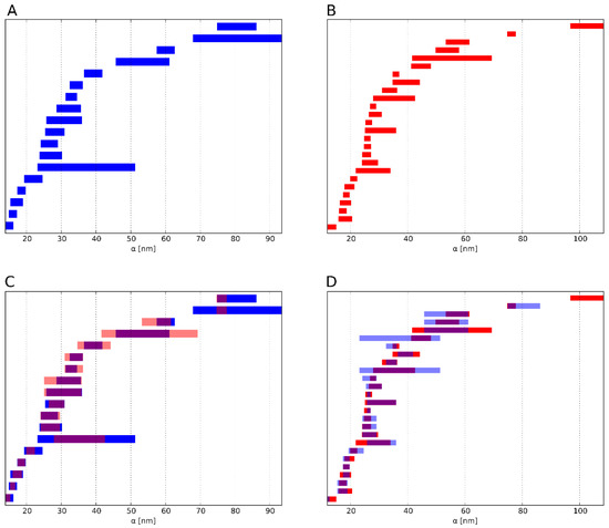 Example of the result of the barcode similarity measure. For each bar of barcode (A) (blue), the bar from (B) (red) is sought for which the Jaccard index is maximal. (C) The Jaccard index represents the extent to which two bars overlap (pink). This corresponds to C in equation S(A,B). These values are summed for each bar of A. (D) Analogously, for each bar from B the bar from A is sought, for which the Jaccard index becomes maximal. This corresponds to D in equation S(B,A). These values are in turn summed for the bar of B. The sum of these two subtotals is divided by the number of bars in both barcodes. The result S(A,B) or S(B,A) quantifies the similarity of the barcodes A and B in terms their overlap. Here, two barcodes of dimension 1 (holes) with a high similarity are depicted, i.e., the overlap of the two sets of barcodes is high. For comparison, we illustrate two dissimilar barcodes of dimension 1 in the supplementary material (see Figure S3).