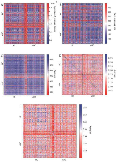 Heat maps depicting the similarity of HC- and nHC-associated γH2AX clusters according to (A) cluster density, (B) cluster size indicating a high similarity (see also Figure S2), (C) topological similarity of the connected components (“lines”), (D) topological similarity of the “holes”, (E) average topological similarity. The spectrum of the color bar of all the heat maps ranges from red representing dissimilarity between the analyzed clusters to blue depicting similarity.