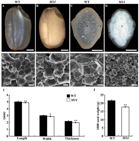 Phenotype analyses of M14 seeds. (A,B) The appearance of brown rice of WT and M14. (C,D) Transverse sections of WT and M14 seed. Bars = 1 mm (A–D). (E–H) Scanning electron microscope observation of WT and M14 seeds. (E,F) represent the region of “1” and “2” in WT endosperm, respectively, and (G,H) represent the region of “1” and “2” in M14 endosperm, respectively. Bars = 5 μm (E–H). (I) Seed length, width, and thickness of WT and M14 (n = 20). (J) 1000-seed weight of WT and M14. Data are given as means ± SD (n = 3). ** and * indicate significant differences between WT and M14 at p < 0.01 and p < 0.05 by Student’s t test.