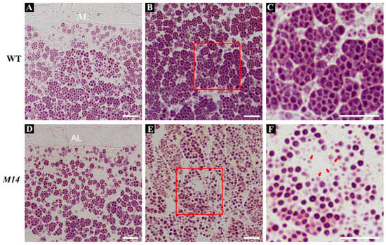 The formation of abnormal compound starch granules in M14 endosperm. (A–F) Semi-thin sections of WT (A–C) and M14 (D–F) kernels at 9 DAF are stained with I2-KI. (A,D) and (B,E) represent the outer and inner of endosperm, respectively. (C,F) represent the magnified region indicated by red outline in WT and M14 endosperm, respectively. Red arrowheads in (F) indicate abnormal weakly stained starch granules. AL, aleurone layer. Bars = 20 μm.