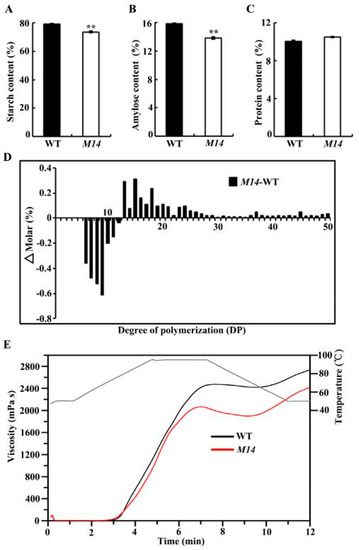 The seeds of WT had a starch content of 79.1%, whereas the M14 had a significantly decreased starch content (73.6%) (Figure 3A). The amylose content decreased in M14 (13.8%) compared with WT (15.8%) (Figure 3B), but protein content slightly increased (10.5% vs. 10.0%) (Figure 3C). The amylopectin fine structure analysis showed that the short branch-chains with degree of polymerization (DP) 6–12 increased in M14, whereas the intermediate branch-chains with DP 13–50 decreased compared with WT (Figure 3D). The thermal properties of WT and M14 starches were measured by differential scanning calorimetry (DSC), and their thermal parameters are shown in Table 1. The gelatinization onset temperature, peak temperature, and conclusion temperature of M14 starch were all about 2 °C lower than those of WT starch. The pasting properties of WT and M14 starches determined by rapid visco analyzer (RVA) are presented in Figure 3E, and their pasting parameters are given in Supplemental Table S1. The M14 starch had significantly lower peak viscosity, hot viscosity, and final viscosity than WT starch. In conclusion, the physicochemical characteristics of M14 starch changed significantly compared with WT starch.