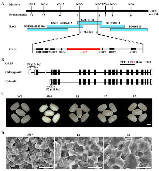 - Qiao, Y.; Lee, S.I.; Piao, R.; Jiang, W.; Ham, T.H.; Chin, J.H.; Piao, Z.; Han, L.Z.; Kang, S.Y.; Koh, H.J. Fine mapping and candidate gene analysis of the floury endosperm gene, FLO(a), in rice. Mol. Cells 2010, 29, 167–174. [Google Scholar] [CrossRef] [PubMed]