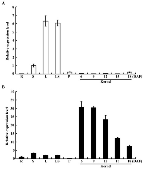 Expression pattern of OsPPDKB. (A) Expression analysis of the chOsPPDKB in various tissues and developing kernels of WT. (B) Expression analysis of the cyOsPPDKB in various tissues and developing kernels of WT. R, root; S, stem; L, leaf; LS, leaf sheath; P, panicle. Actin1 is used as an internal control. All data are given as means ± SD (n = 3).