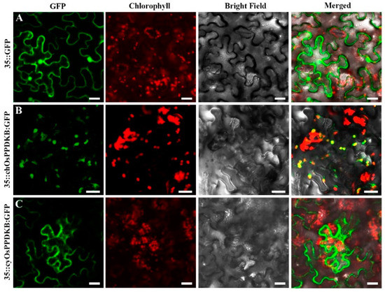 To identify the subcellular localization of OsPPDKB, two GFP fusions, chOsPPDKB-GFP and cyOsPPDKB-GFP, were transiently expressed in Nicotiana benthamiana leaves. The free GFP protein was widely distributed in the nuclei and cytoplasm (Figure 6A), while the chOsPPDKB-GFP proteins co-localized exclusively with chlorophyll autofluorescence signals (Figure 6B) and the cyOsPPDKB-GFP was localized in cytoplasm, which displayed a dispersed distribution throughout the leaves (Figure 6C).