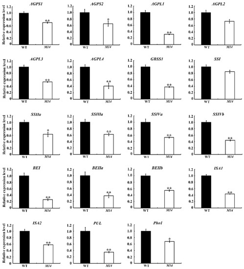 Expression of starch biosynthesis-related genes in WT and M14. Total RNA extracted from 9 DAF endosperm is used for qRT-PCR analysis. ADP glucose pyrophosphorylase small subunit (AGPS1 and AGPS2) and large subunit (AGPL1, AGPL2, AGPL3, and AGPL4); granule-bound starch synthase I (GBSSI); soluble starch synthase I, IIa, IIIa, IVa, and IVb (SSI, SSIIa, SSIIIa, SSIVa, and SSIVb); branching enzyme I, IIa, and IIb (BEI, BEIIa, and BEIIb); isoamylase isozymes (ISA1 and ISA2); pullulanase (PUL); plastidial phosphorylase (Pho1). The expression level of every target gene in WT is set at 1.0. All data are given as means ± SD (n = 3). ** and * indicate significant differences between WT and M14 at p < 0.01 and p < 0.05 by Student’s t test.
