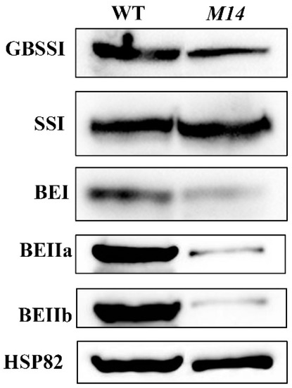 Accumulation of proteins involved in starch synthesis in WT and M14 endosperm at 9 DAF. Anti-GBSSI, anti-SSI, anti-BEI, anti-BEIIa and anti-BEIIb are used for the immunoblot analysis. Anti-HSP82 is used for the loading control.