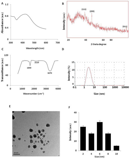 Synthesis and characterization of AgNPs was carried out as described previously [17]. Synthesis of AgNPs was carried out using naringenin (NAR) dissolved in dimethyl sulfoxide. AgNPs were synthesized by incubating 50 µM NAR in 100 mL of water containing 2 mM AgNO3 at 37 °C for 1 h. The color change from pale yellow to dark yellowish-brown was attributed to the formation of AgNPs in the reaction mixture.