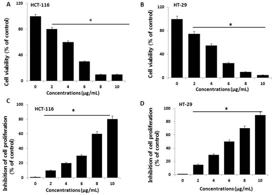 To evaluate the potential toxicity effects of AgNPs, HCT116 and HT-29 cells were treated with various concentrations of AgNPs (2–10 µg/mL), and cell viability was determined based on mitochondrial activity. After 24 h of exposure, mitochondrial activity was decreased in response to a concentration of 2 µg/mL, and the cell viability rapidly decreased when AgNP concentrations were increased from 2 to 10 µg/mL (Figure 2A). At 4–10 µg/mL AgNPs, mitochondrial activity significantly decreased to 50% for cells exposed to 5 and 4 µg/mL AgNPs in HCT116 and HT-29 cells, respectively. At this time point and dose, mitochondrial activity was significantly reduced in AgNP-exposed cells. Miethling-Graff et al. [34] reported the size-dependent (10, 20, 40, 60, and 100 nm) effects of AgNPs in the human LoVo cell line. The authors found that cellular uptake and toxicity were regulated by size, and smaller particles easily penetrated the cells, while larger particles such as 100-nm particles did not. Similarly, para-hydroxybenzoate tetrahydrate (SPHT)-assisted synthesis of AgNPs showed dose- and time-dependent inhibition of cell viability in the human colon cancer cell lines, HCT15 and HT-29. Cells exposed to SPHT-AgNPs (8 µg/mL) displayed 50% inhibition of cell proliferation after 24 h of treatment [35]. Plant-assisted AgNPs showed greater anti-proliferative effects against HCT116 cells at a minimum concentration of approximately 450 nM than synthetic AgNPs and AgNO3 [36]. Abutilon indicum-assisted AgNPs showed dose-dependent anti-proliferative effects against COLO 205 (human colon cancer) and MDCK (normal) cells [37].