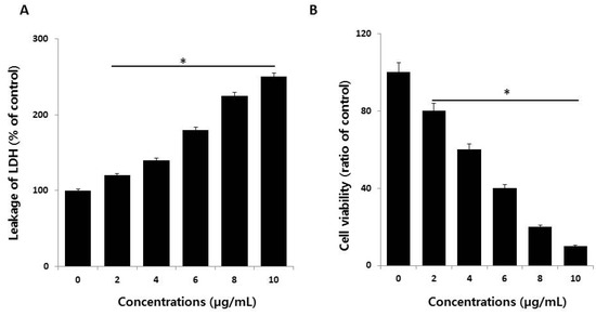 Measurement of lactate dehydrogenase (LDH) leakage and cell-death protease activity. (A) LDH activity was measured at 490 nm using an LDH cytotoxicity kit. (B) The level of dead-cell protease was determined using the CytoTox-Glo cytotoxicity assay. The results are expressed as the mean ± standard deviation of three independent experiments. There was a significant difference in the ratio for AgNP-treated cells compared to untreated cells, determined by a Student’s t-test (* p < 0.05).