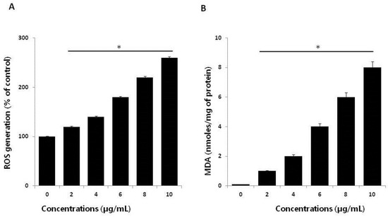Effect of AgNPs on reactive oxygen species (ROS) generation. (A) HCT116 cells were treated with or without AgNPs for 24 h, and ROS generation was measured using 2′,7′-dichlorodihydrofluorescein diacetate (DCFH-DA). (B) HCT116 cells were treated with AgNPs for 24 h. After incubation, the cells were harvested and washed twice with ice-cold phosphate-buffered saline (PBS) solution. The cells were collected, and disrupted by ultrasonication for 5 min on ice. Lipid peroxidation (LPO) was determined via the reaction of malondialdehyde (MDA) with thiobarbituric acid to form a colorimetric (532 nm)/fluorometric (excitation and emission wavelengths of 532 and 553 nm, respectively) product, whose quantity was proportional to that of MDA. The results are expressed as the mean ± standard deviation of three independent experiments. There was a significant difference in the ratio for AgNP-treated cells compared to untreated cells, determined by a Student’s t-test (* p < 0.05).
