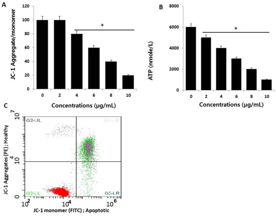 Measurement of mitochondrial membrane potential (MMP) and ATP. (A) HCT116 cells were treated with AgNPs for 24 h. The change in MMP was determined using the cationic fluorescent dye, JC-1 (Molecular Probes, Eugene, OR, USA). (B) Flow cytometric analysis (FACS) of the mitochondrial membrane potential using the JC-1 dye in HCT116 cells treated with AgNPs (half maximal inhibitory concentration (IC50) 3 µg/mL) for 24 h. (C) The ATP level was measured according to the manufacturer’s instructions (Sigma-Aldrich, St. Louis, MO, USA; Catalog Number MAK135) in HCT116 cells exposed to AgNPs for 24 h. The results are expressed as the mean ± standard deviation of three independent experiments. There was a significant difference in the ratio of AgNP-treated cells compared to untreated cells, determined by a Student’s t-test (* p < 0.05).