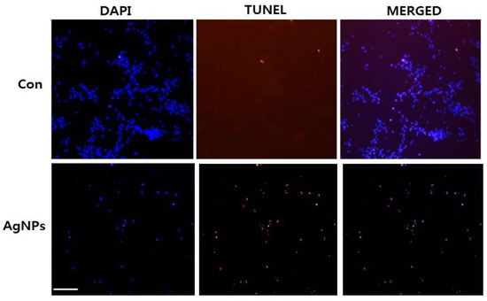 High ROS levels induce oxidative stress and cell death [57]. Previously, our lab and other research groups showed that AgNP-induced cytotoxicity primarily results from oxidative stress which, in turn, induces cell death through activation of the intrinsic pathway of apoptosis, autophagy, or both [15,39,46,53]. We examined whether AgNP-induced cell death occurs via apoptosis using terminal deoxynucleotidyl transferase-mediated dUTP nick end labeling (TUNEL) analysis. Oxidative stress is a crucial factor for inducing apoptosis in cancer cells through various mechanisms causing macromolecular damage, such as lipid peroxidation, DNA fragmentation, protein denaturation, and mitochondrial dysfunction [53]. ROS can act as signal molecules to promote cell-cycle progression and induce oxidative DNA damage [51,58]. Measurement of DNA fragmentation appears to be the best technique for evaluating AgNP-induced apoptosis. To detect apoptotic features induced by AgNPs, HCT116 cells were treated with the half maximal inhibitory concentration (IC50) of AgNPs, and a DNA-fragmentation assay was conducted. The results, shown in Figure 6, revealed a significant number of positively labeled cells, representing apoptotic DNA fragmentation. In control cultures, few or no apoptotic cells were observed. Characteristic features of apoptosis include cell shrinkage, chromatin condensation, extensive plasma membrane bleb, and separation of cell fragments into apoptotic bodies [59]. Cancer cell lines treated with AgNPs exhibited the same “laddering” pattern as evidenced by DNA fragmentation observed in this study [14]. During DNA fragmentation, the deposition of silver particles inside the nucleus may affect DNA and cell division, and nanoparticles may induce dose-dependent DNA damage, chromosomal aberrations, and errors in chromosome segregation, as well as the formation of sister chromatic exchanges [60]. Our results are consistent with those of previous studies showing that cancer cells treated with AgNPs induce the production of micronuclei [51]. Therefore, we found that AgNPs induce DNA fragmentation, and eventually, induce apoptosis in HCT116 cells.