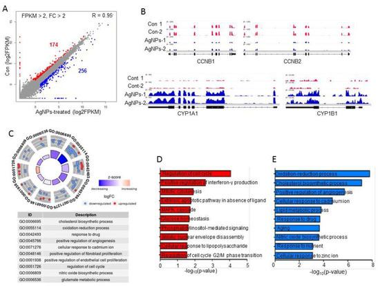 Impact of AgNPs on gene expression. (A) Scatter plot showing up- and downregulated genes in AgNP-treated HCT116 cells. The log2 fragments per kilobase of transcript per million mapped reads (FPKM) values were used for plotting. Red and blue dots indicate downregulated and upregulated genes in AgNP-treated HCT116 cells, respectively. Cut-off: FPKM ˃2 and fold change ˃2. (B) Representative IGV images of down- (CCNB1 and CCNB2) and upregulated (CYP1A1 and CYP1B1) genes. (C) Gene Ontology (GO) term analysis using both up- and downregulated genes. Each red (downregulated) or blue (upregulated) dot represents one gene belonging to each term. (D,E) bar graphs showing GO terms of individual up- and downregulated genes.