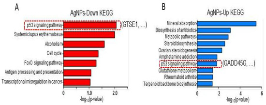KEGG pathway analysis. (A,B) Bar graphs showing biological pathways associated with down- and upregulated genes following AgNP administration. The p53 pathway is highlighted with a representative gene in each case.